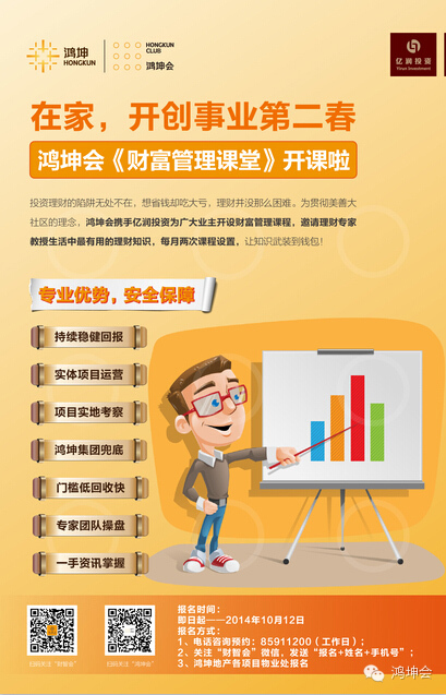 在社区门口学理财,轻松开创自己的事业“第二春”。鸿坤会不仅为广大业主、客户提供家庭理财知识,更为大家提供一个提升生活品质的学习沟通平台。美善生活,从鸿坤会开始!